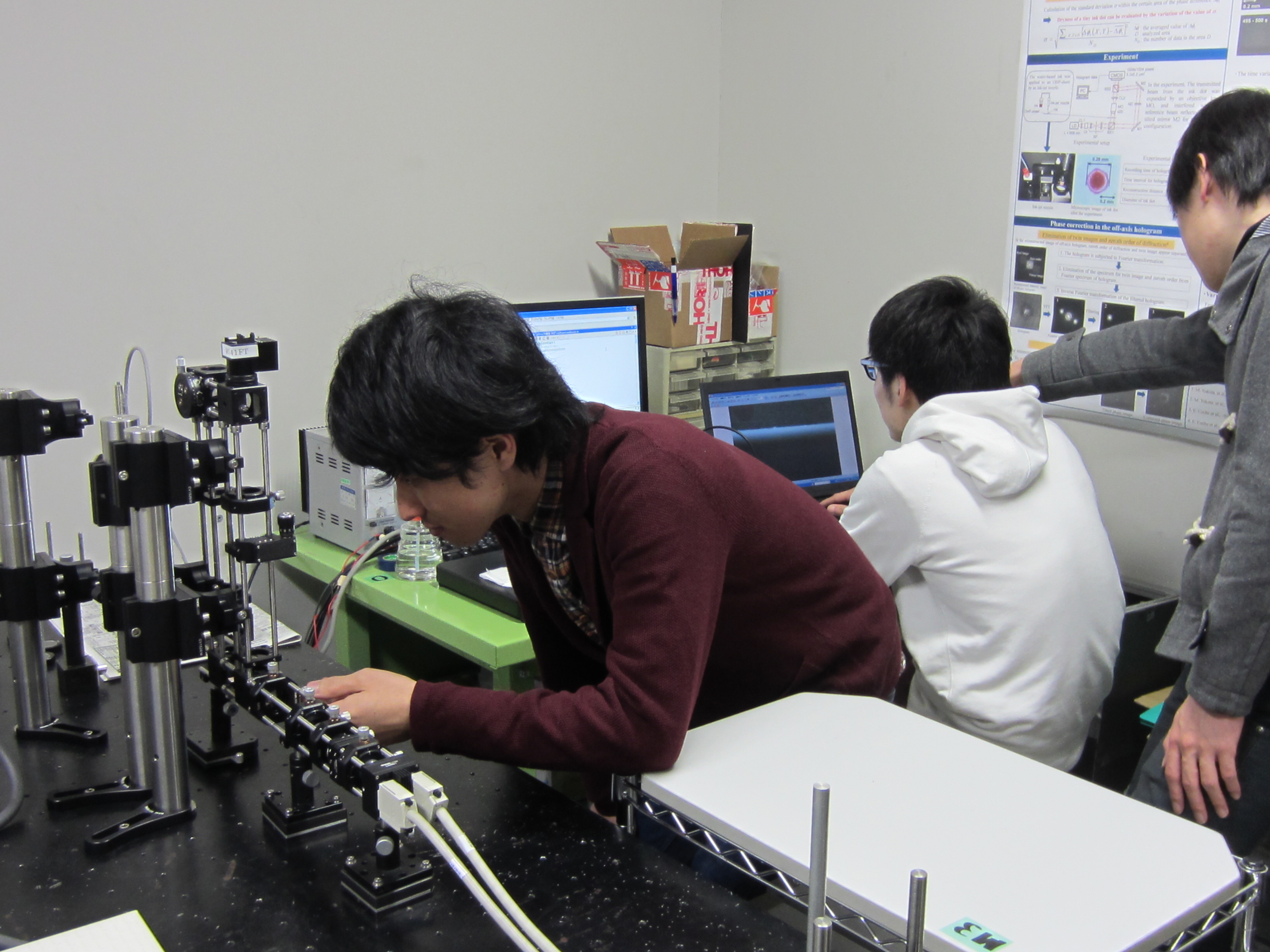 レーザー光の性質を利用して得られる画像をCCDカメラで撮ってコンピューターで処理すると,固体や液体の表面形状や変形,楽器やスピーカーの振動,液体の粘性,温度・濃度などの分布が非接触で測定できます。本研究室では,各種のレーザー,光ファイバー,CCDカメラなどのオプトエレクトロニクス素子,さらにディジタル信号処理技術や光通信技術を積極的に取り込み,実験室だけでなく,生産現場でも使える新しい計測や情報処理の手法の開発を目指していきます。